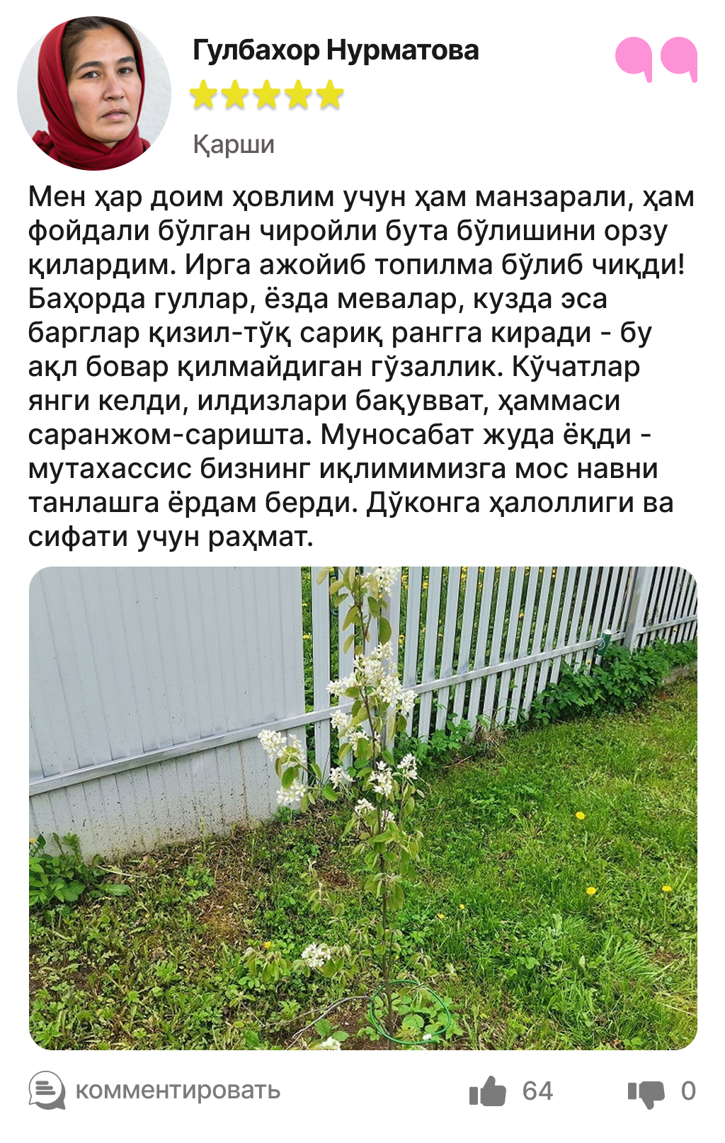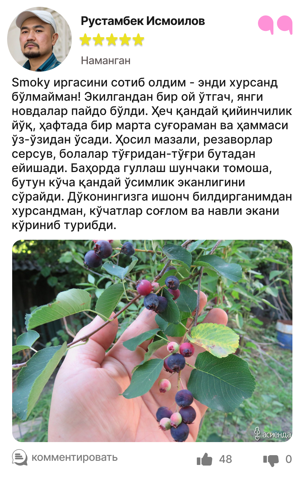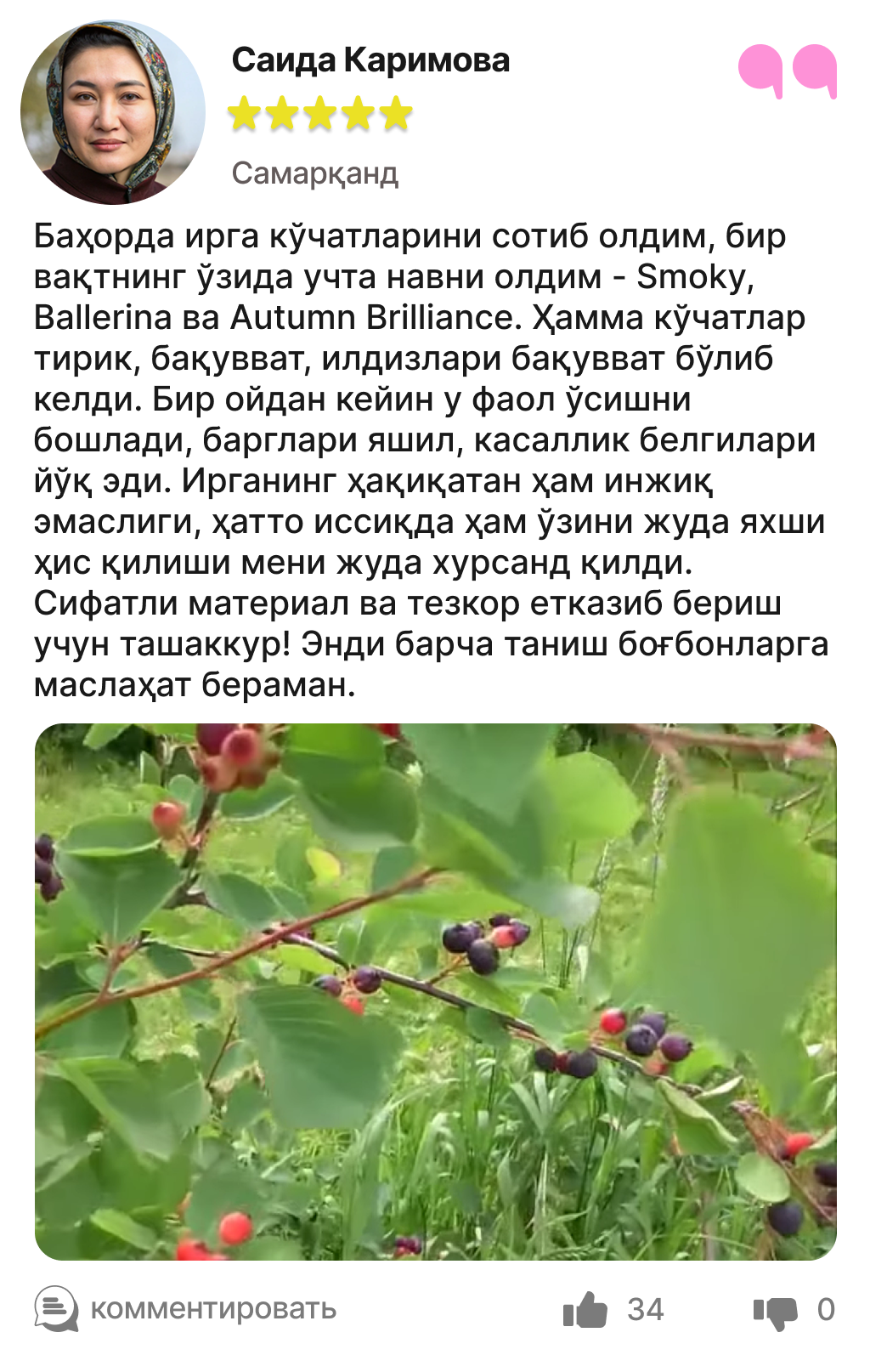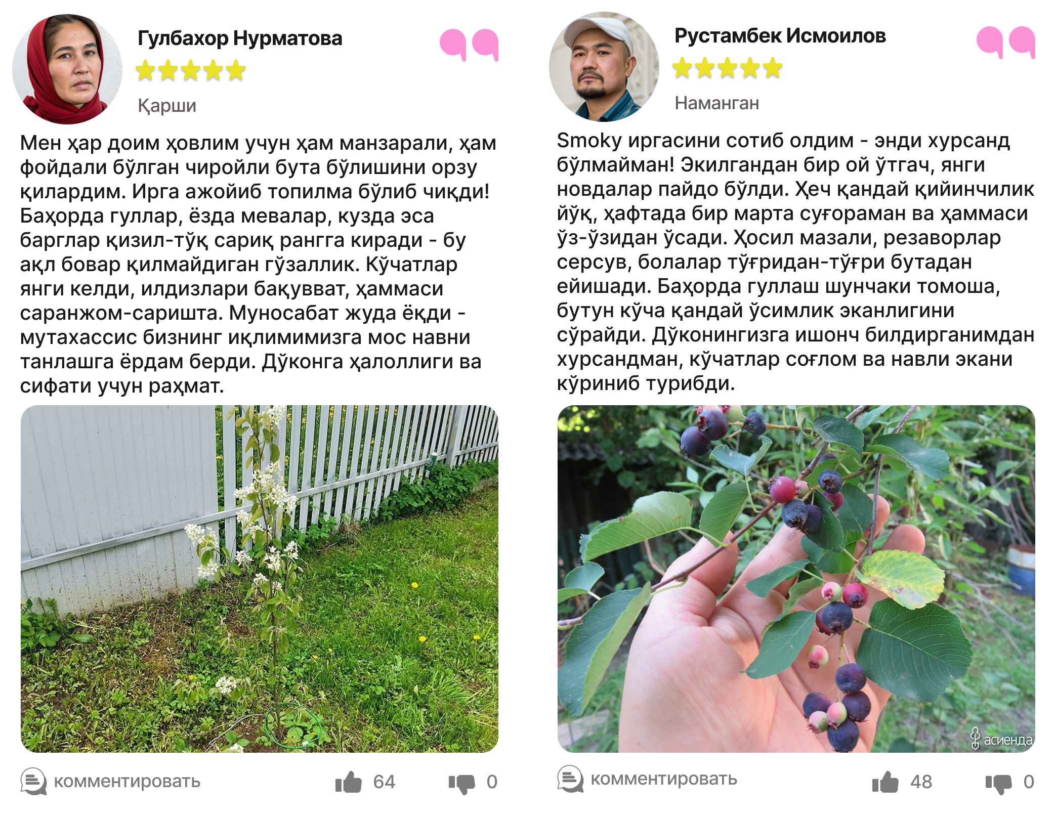Харидорларимиз сотиб олинган ва етиштирилган ирга кўчатлари ҳақидаги таассуротлари билан ўртоқлашмоқда.