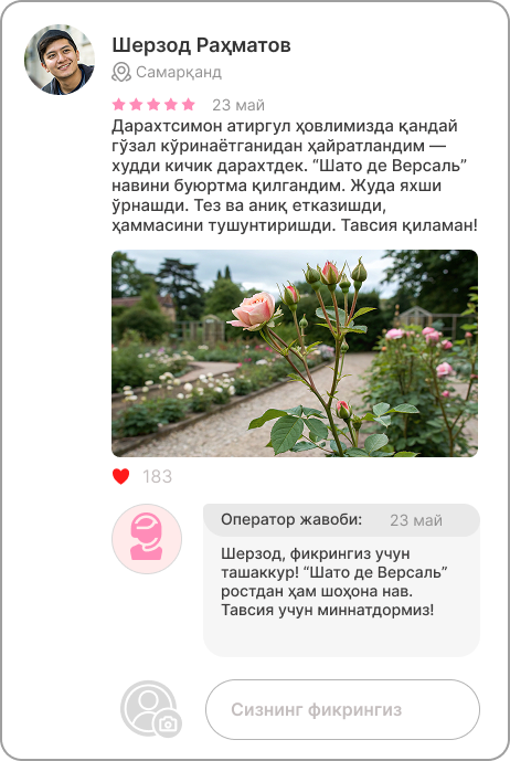Дарахтсимон атиргул ниҳолларига буюртма бериш учун ариза қолдиринг — операторларимиз сиз билан тез орада боғланиб, расмийлаштиришда ёрдам беришади!